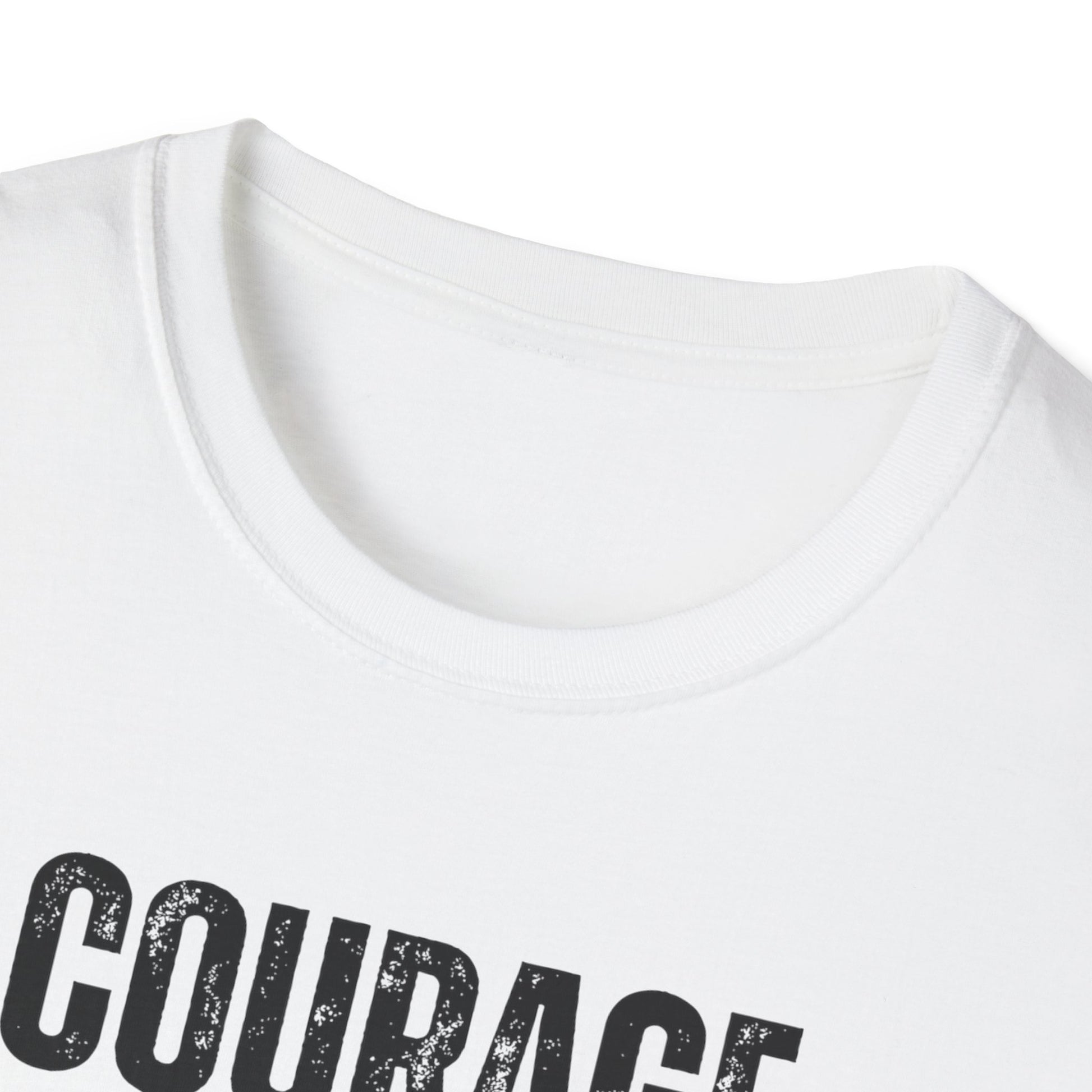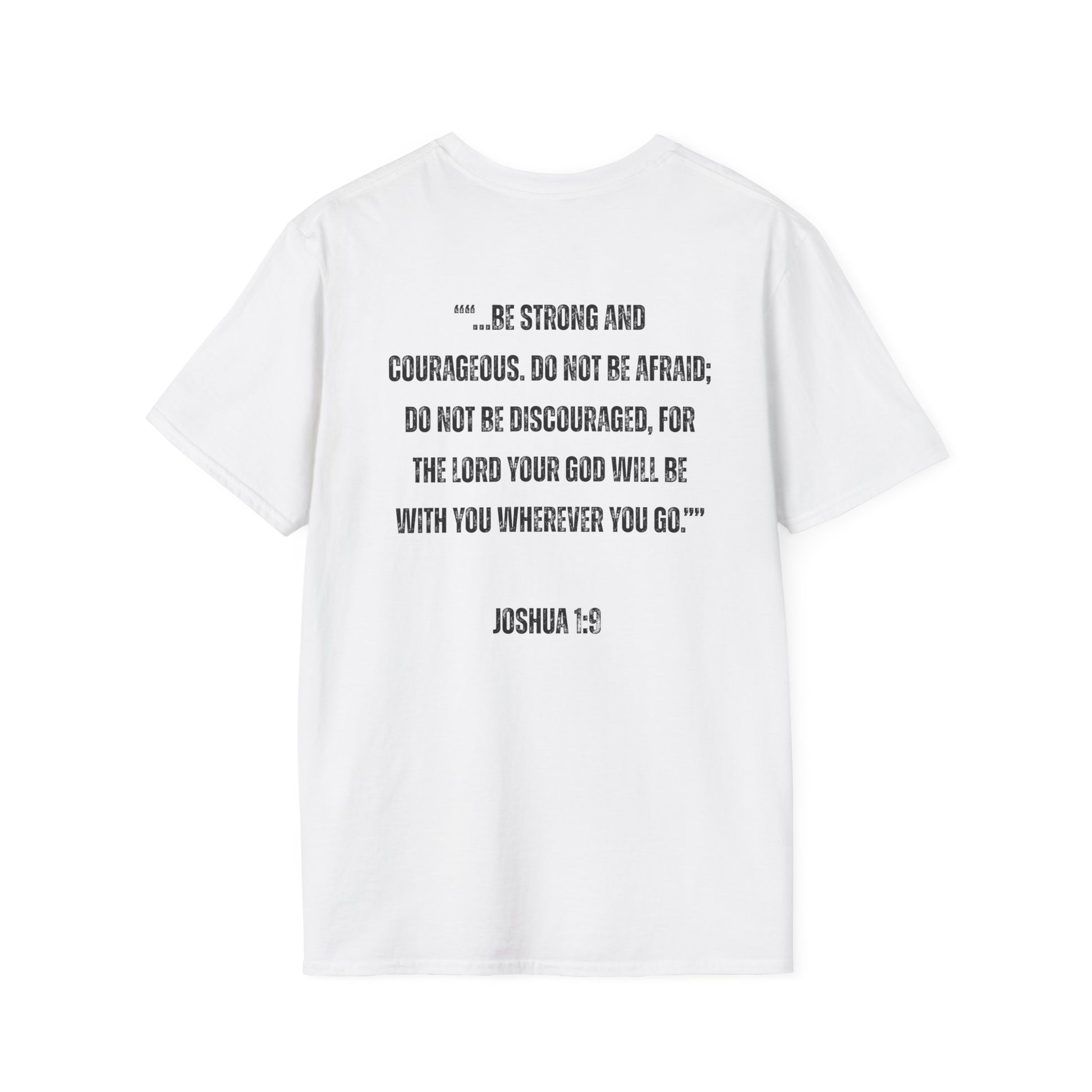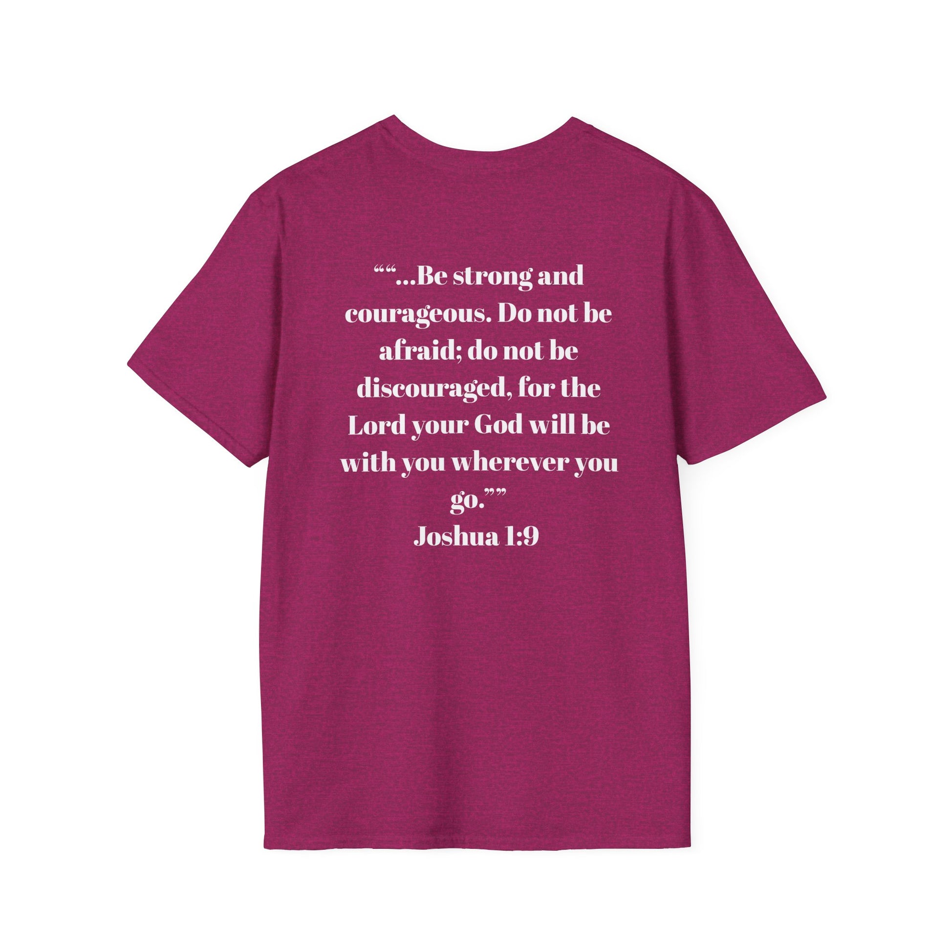 A unisex softstyle t-shirt featuring the inspirational quote 'Courage Joshua 1:9'. This comfortable and versatile tee is perfect for daily wear or as a thoughtful gift for those seeking encouragement and strength in their faith. Ideal for adults looking for a durable and smooth fabric for printing.
