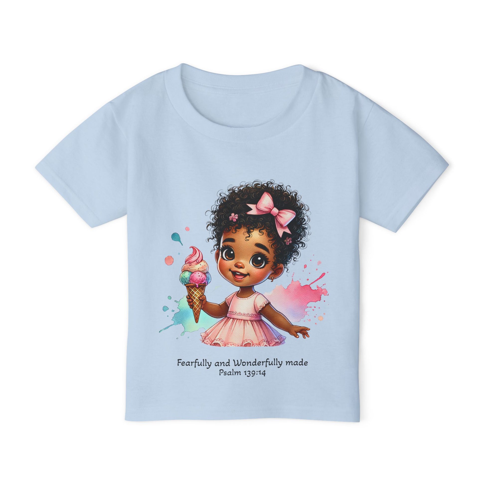 A cute and meaningful Toddler T-shirt featuring a design of a brown little girl with the text 'fearfully and wonderfully made psalm 139:14'. This shirt exudes a message of self-love and empowerment, perfect for little ones to wear with pride. Ideal for parents looking to dress their child in a positive and inspiring outfit.