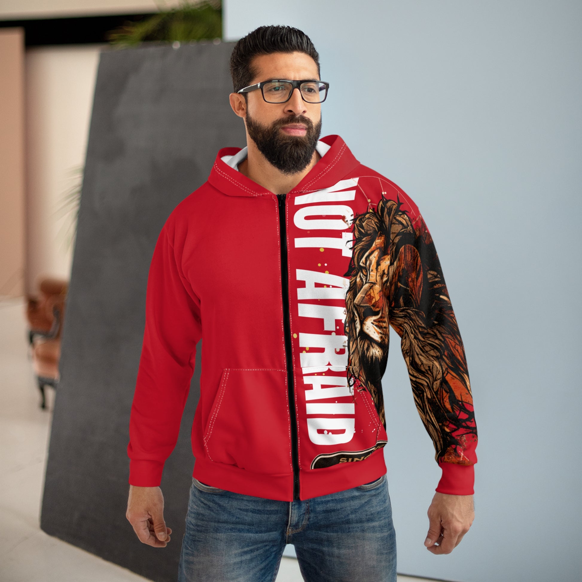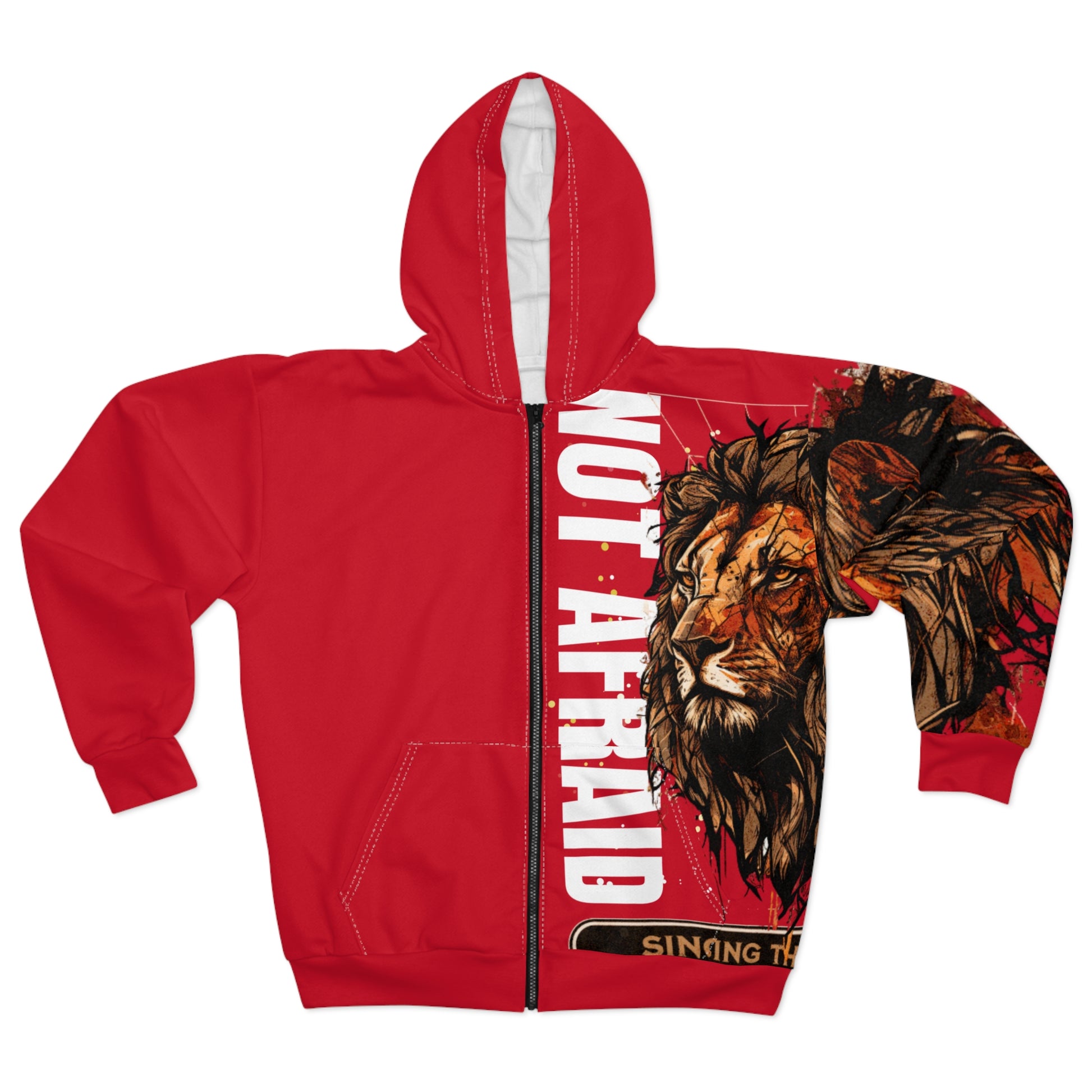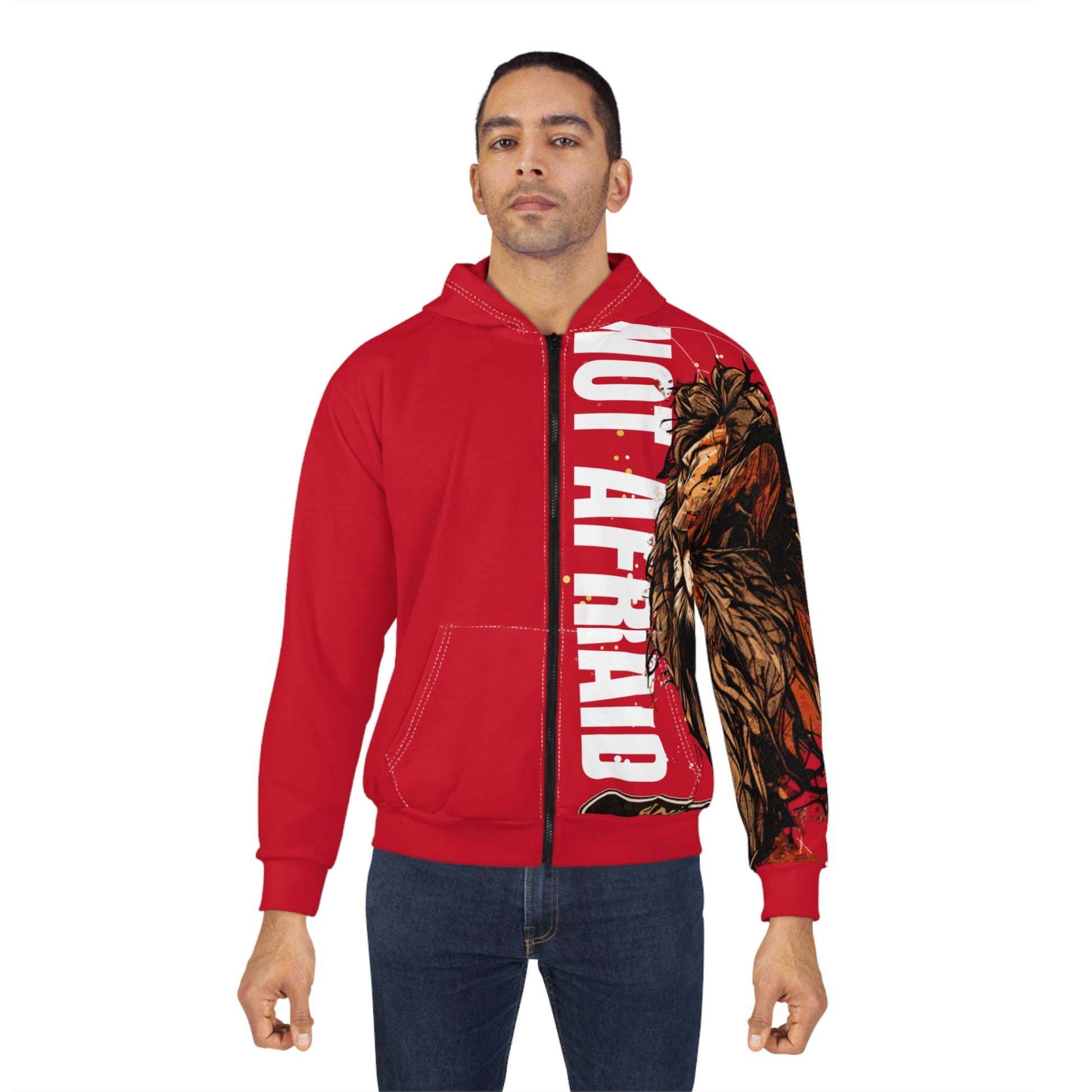 Stay cozy and stylish with this 'Not Afraid' zip hoodie. The bright and intense colors of the design give a bold and fearless vibe, perfect for those looking to make a statement. This hoodie is perfect for anyone who wants to stay warm and stand out from the crowd. Ideal for casual wear, outdoor activities, and streetwear fashion. Great for everyday wear.